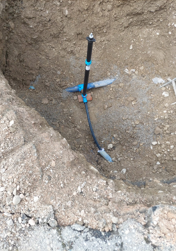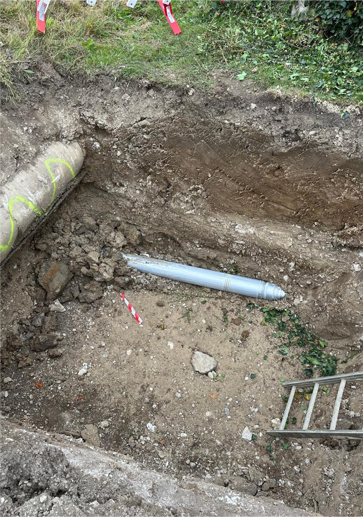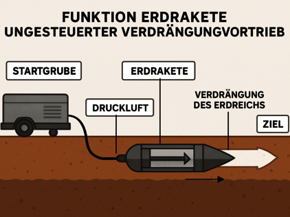 Die Entscheidung fiel daher auf ein pneumatisches Verdrängungsverfahren mit Erdraketen vom Typ EN 95 mm und 130 mm. Detaillierte Informationen zum Einsatz von Erdraketen finden Sie im nächsten Abschnitt.