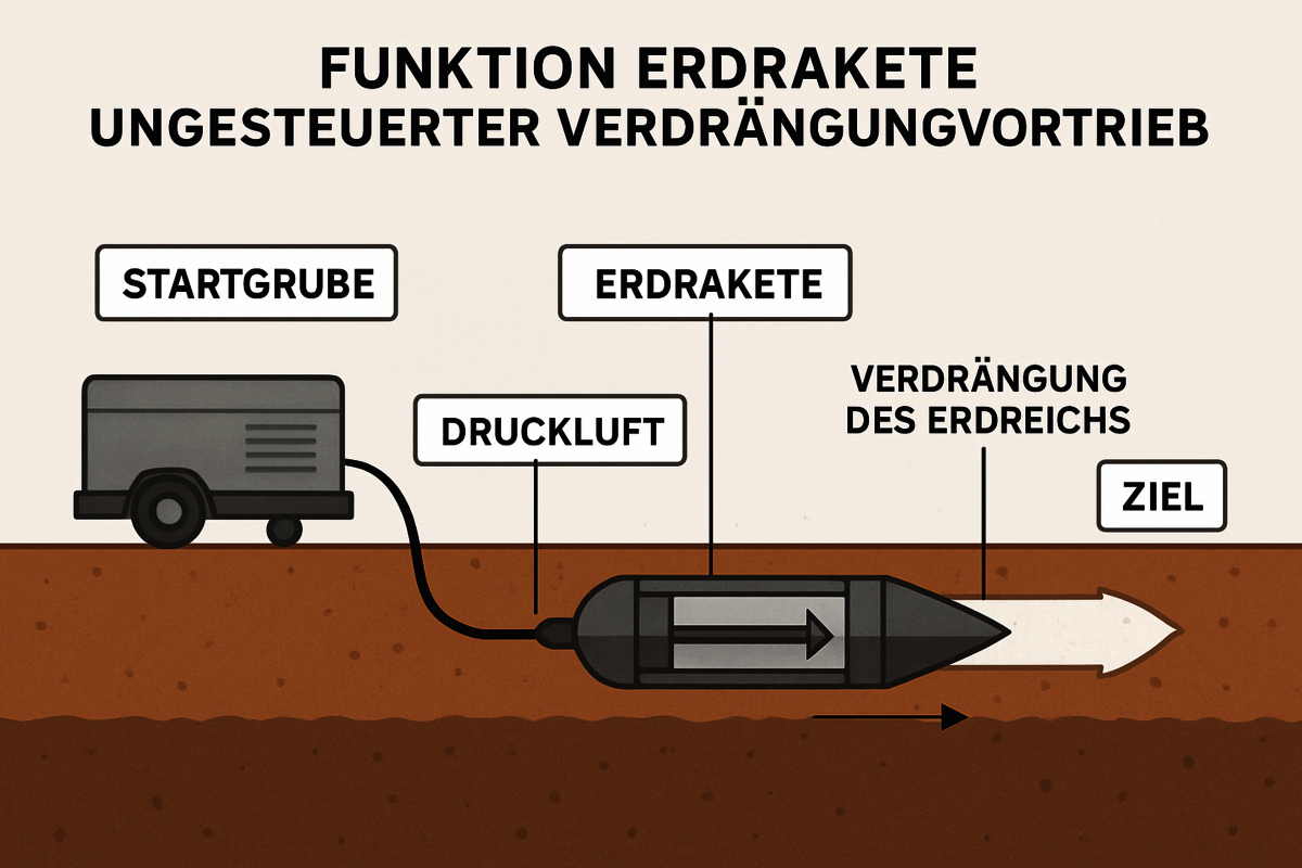 Die Erdrakete hat eine konische Spitze, durch den Vorschub wird das Erdreich seitlich verdrängt, es entsteht ein Hohlraum (Bohrloch). Am Zielort (meist gegenüberliegende Zielgrube) taucht die Rakete wieder auf. In das erstellte Bohrloch kann nun ein Kabel oder Rohr eingesetzt werden bzw. wird meist das Rohr gleich am Ende der Rakete mitdurchgezogen. Die Erdrakete kann für eine Länge von 0 bis 20 m verwendet werden, in besonderen Fällen bis zu 50 m – wenn es das Erdreich zulässt. Die typischen Durchmesser der Erdraketen betragen 45 – 180 mm.